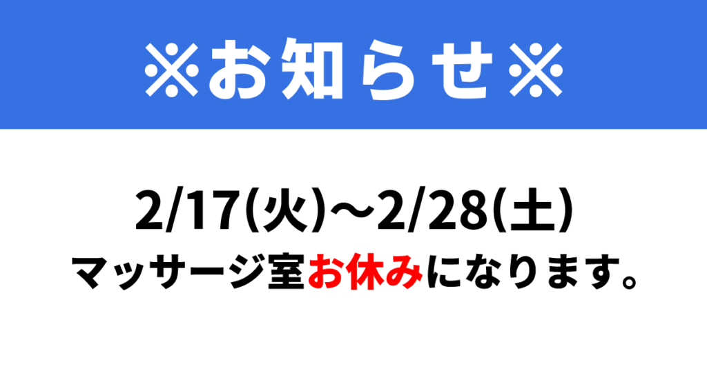 2/17(火)~2/28(土) マッサージ室休業のお知らせ
