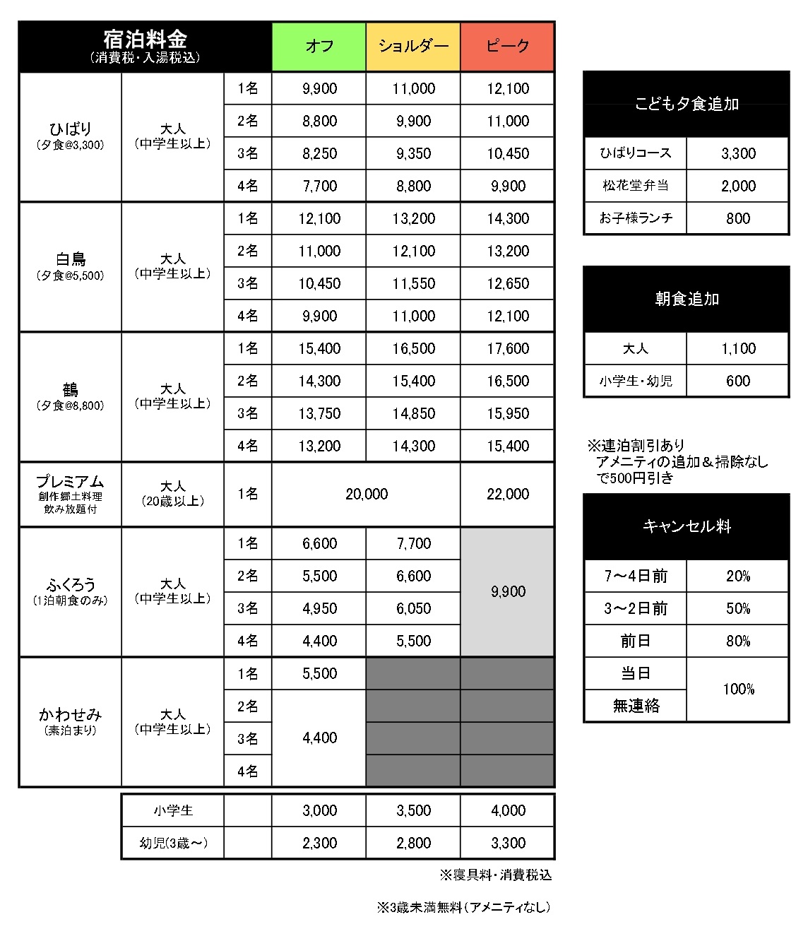 | 4名1室 | 9,900 | 11,000 | 12,100 |
